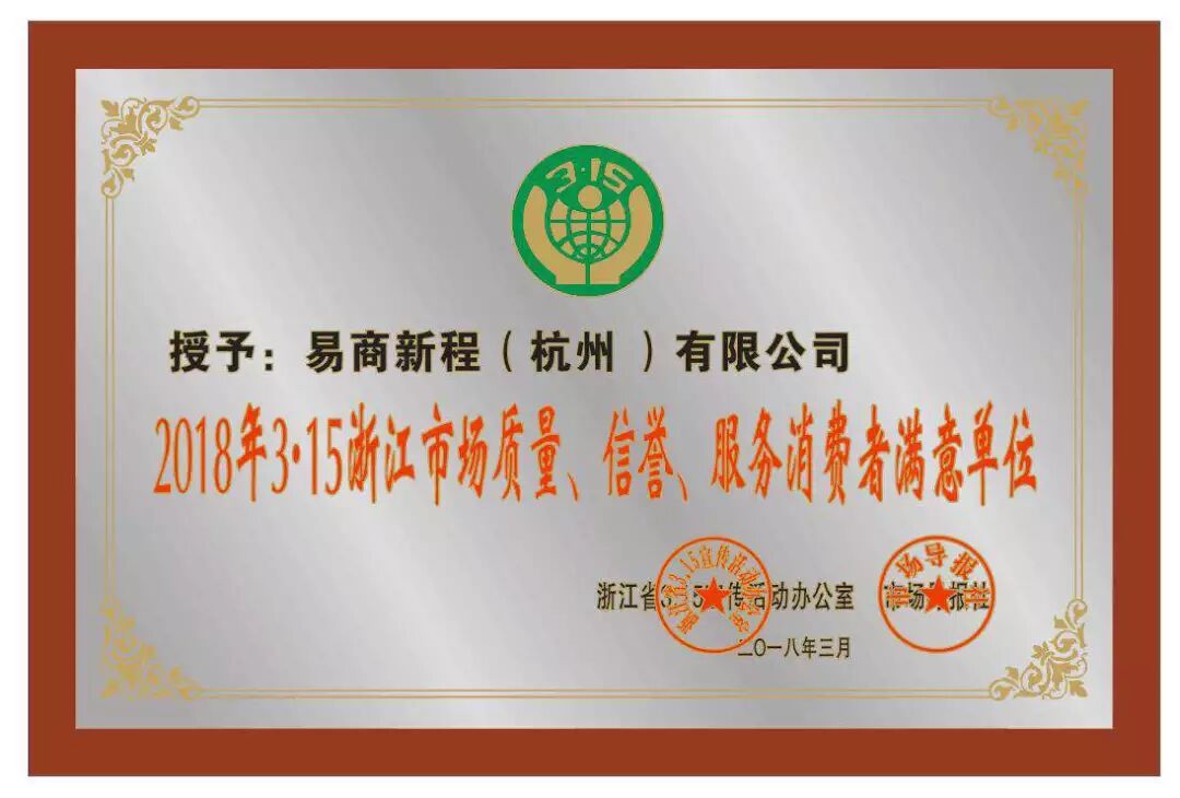 2018年3月15日经过浙江省消保委、浙江省工商局、浙江省3.15宣传办公室、市场导报的严格考评和市场调查,易商新程(杭州)有限公司再次被评定为2018年度《3·15浙江市场质量、信誉、服务消费者满意单位》,并由活动组委会颁发了奖牌。该称号是浙江省工商局和消保委创办的《市场导报》领衔、消费维权全媒体联动相关机构共同发起的,为了给消费者营造良好的消费环境,树立优秀企业典范,本次评选针对浙江省诸多汽车金融企业进行市场诚信度和品牌影响力的调研,万余名消费者不记名投票,选拔结果在强势媒体监督下,于2018年3月15日消费者权益日当天,由浙江省3.15活动办公室品牌影响力调查咨询中心和市场导报社联合颁发。